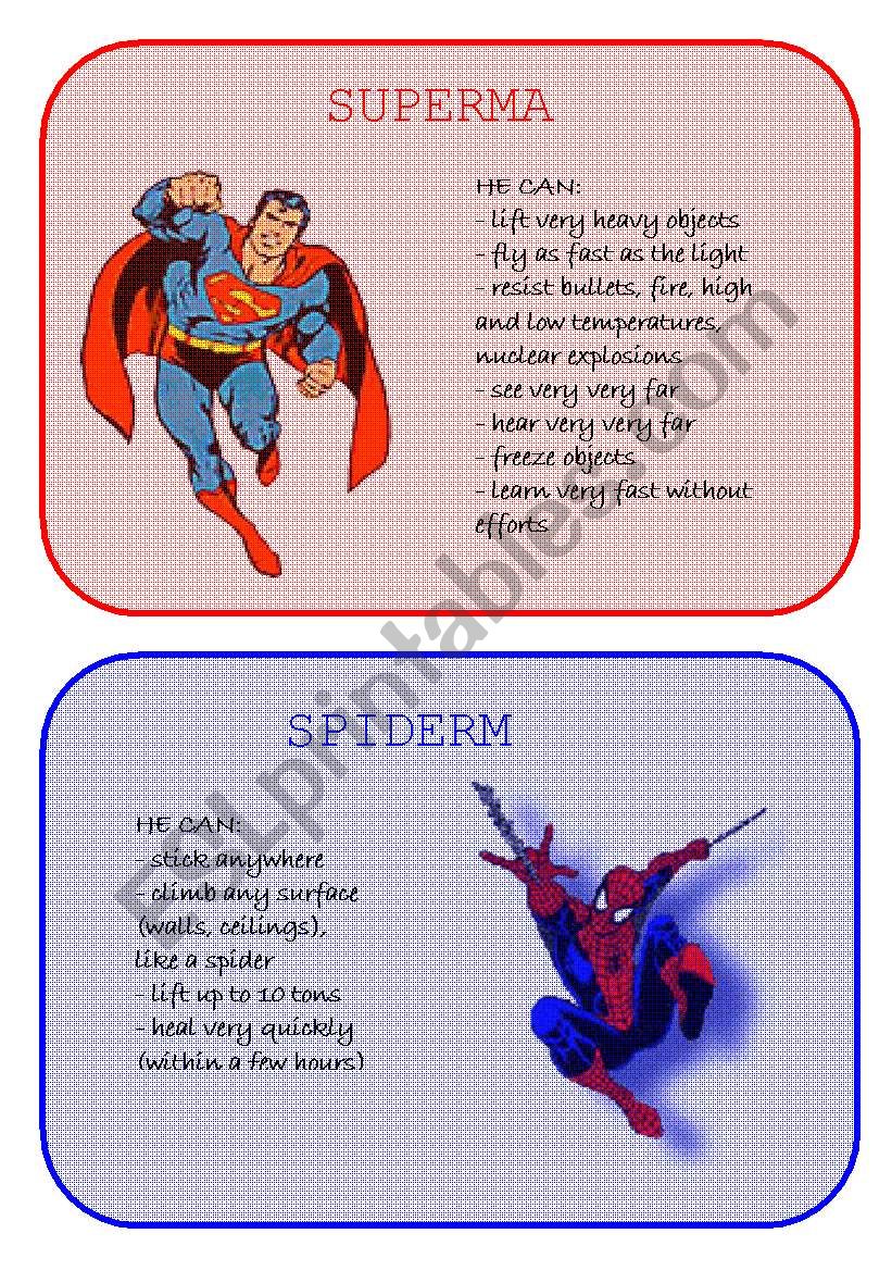 Cards concerning superheroes´ superpowers. Training to use CAN/CAN´T. Can be role played to practice questions.