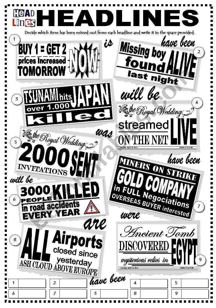 The verb ´to be´ is usually omitted from the headlines. Ss decide what item is missing in each headline. Key included. Have fun and Happy Easter, everyone!
