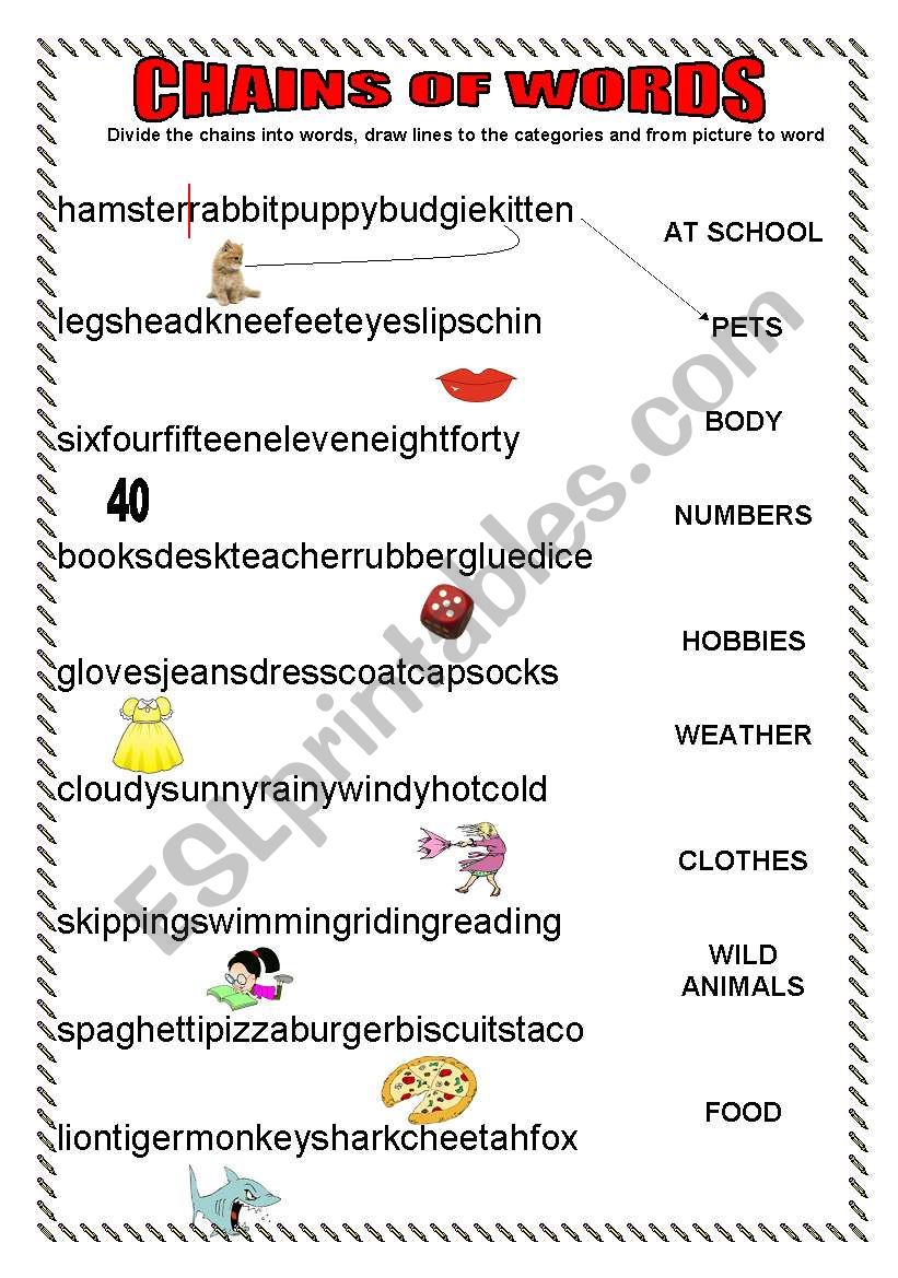 Pupils read and divide the chains into words. Each chain consists of one category. They draw lines to the right category and also between picture and word in each category. Good luck!
