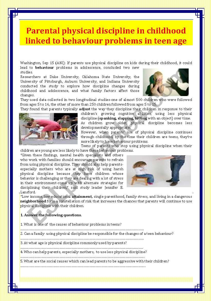 Parental physical discipline in childhood linked to behaviour problems in teen age worksheet