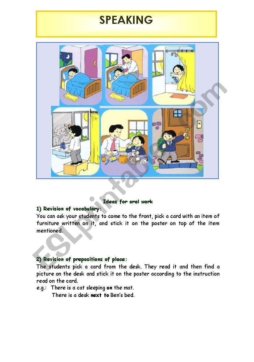 This part of a lesson plan focuses on speaking. You can decide on the context to work on: daily routine, prepositions, on-going actions, or colours. My idea is to use the pictures on a poster stuck on the blackboard and work on the activities suggested, at least two of them, as a warm-up in class. I hope you find it useful or as a hint for your classroom activities.