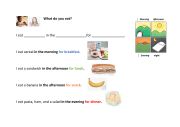 This document contains four pages that can be used as sentence stems to help your students respond to the question, "What do you eat for breakfast/ lunch/ dinner/ snack?".