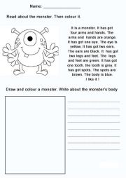 First colour your monster according to the description on the right. Then invent YOUR MONSTER: make it scary with several heads or spots on its face, etc.. Use your imagination. Use the colours you have learnt.
