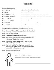Students unscramble the words to create hobbies. Then, complete a dialogue related to the topic. Finally, students draw a hobbie and write about it.