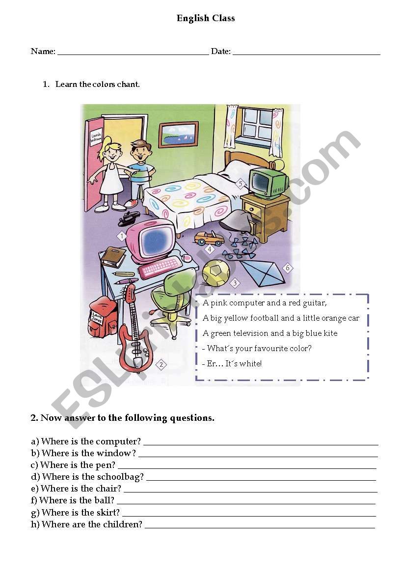 Students learn a chant about colours and answer to where some objects in the picture are.