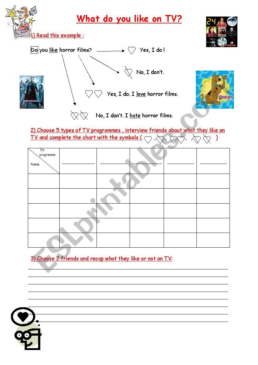 This is a simple worksheet aimed at developing oral skills and grammar skills. After examining an example of a question at the simple present, the pupils have to interview some friends in the class about their likes and dislikes concerning Tv shows. At the end they recap using the third person singular.
