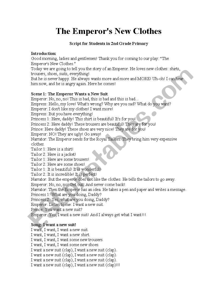 I wrote this script based on Hans Christian Andersen´s classic story. We did it as a special activity for 2nd graders (a group of 25 students, where every child spoke at least two lines) and later performed it for parents. There are four scenes, each of which ends with a short song (I can provide guitar chords if you want). It took us about 15 class sessions altogether, from start to finish. Hope you enjoy!