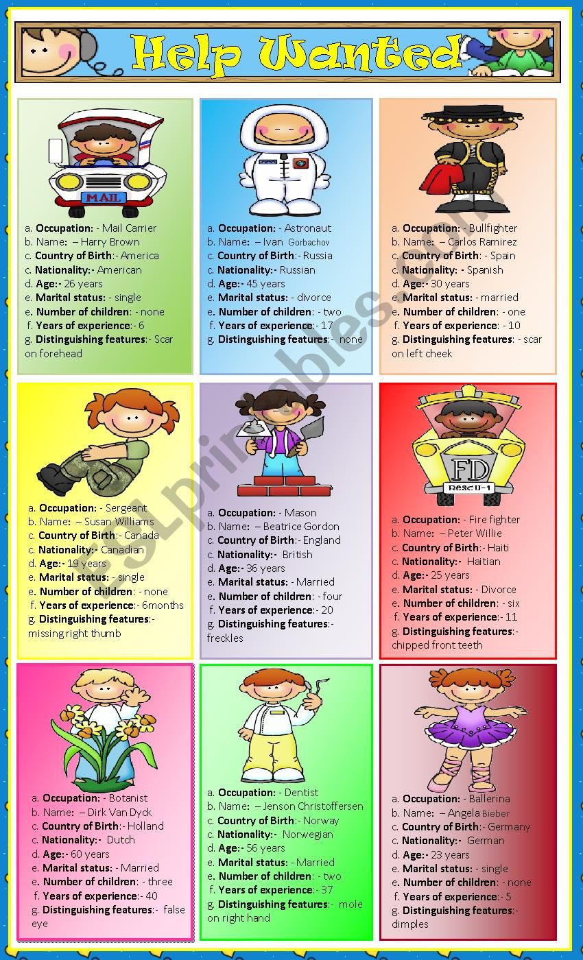 This set of nine speaking cards is based on different occupations. It includes personal information about each employee.Students can ask and answer questions using the information on the cards. Page two allows students to use the picture clues to create their own unique cards on the same topic. Each student can share their info with the class. I hope this activity can be of help to you. Happy Easter...