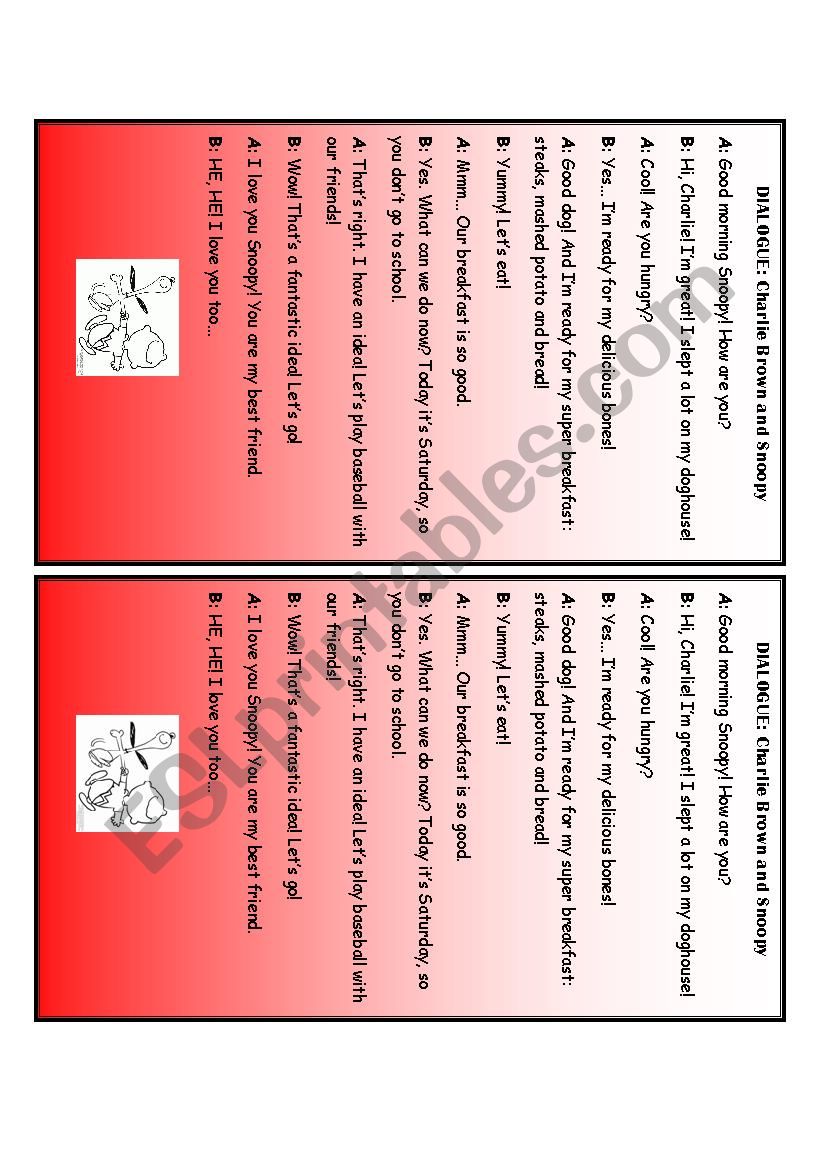 A dialogue between Snoopy and Charlie Brown to practise speaking in pairs.