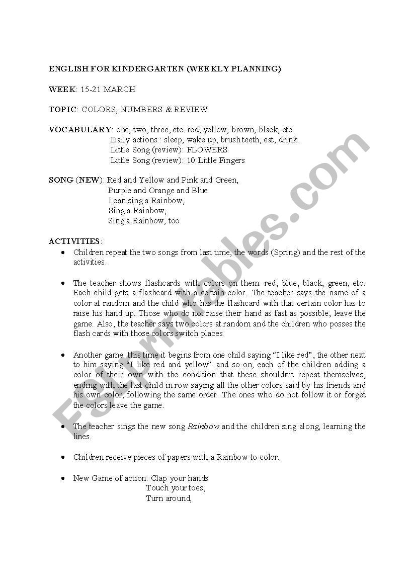 Weekly planning for Kindergarten + Teaching Tips worksheet