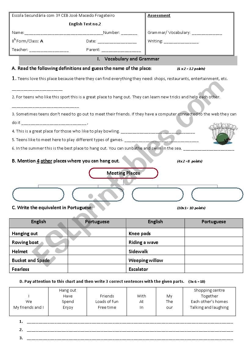 Vocabulary and grammar test on the topic hanging out. The grammar includes phrasal verbs "get" and "take" and verb tenses. There is also a writing activity.
