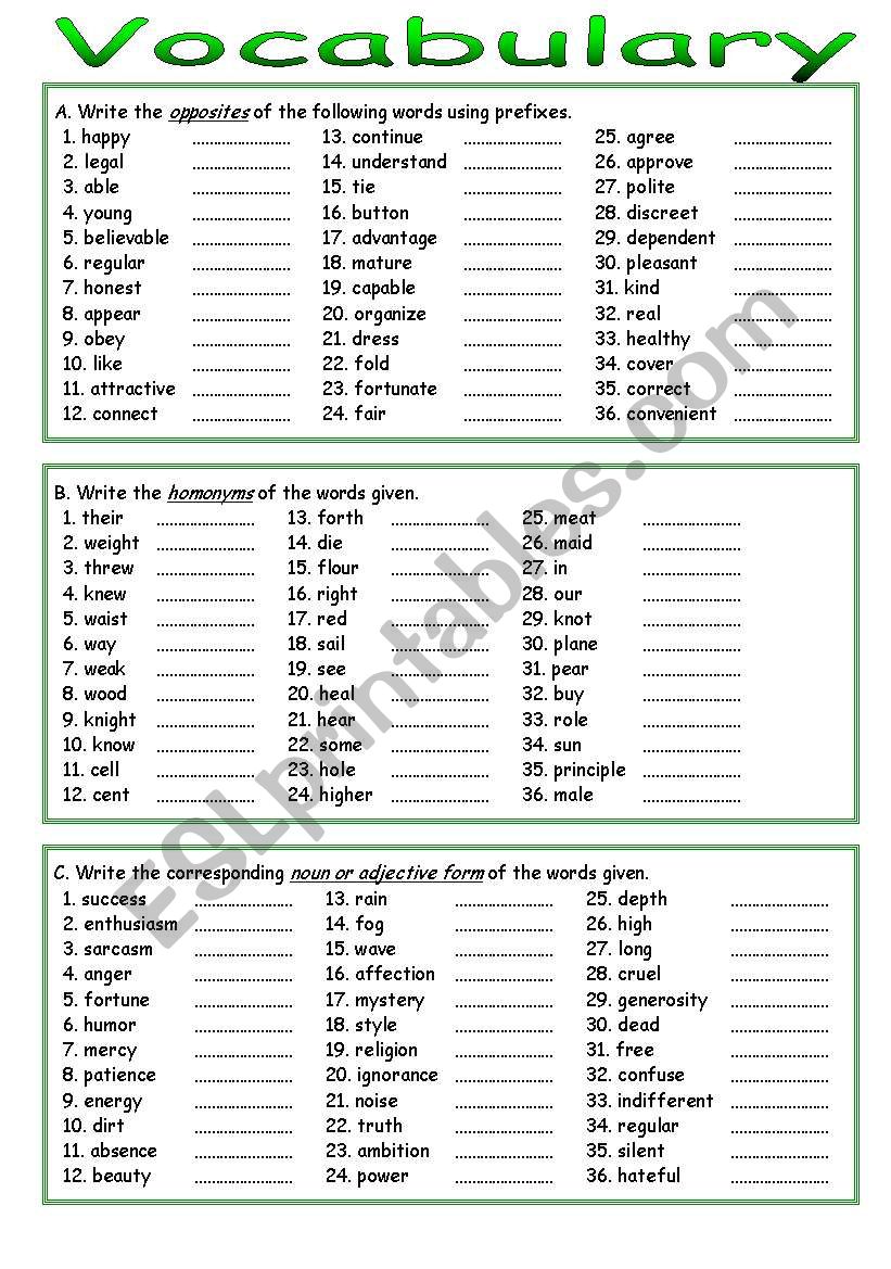 Three exercises on vocabulary: in the first exercise students have to write the opposites of the words given using prefixes, in the second exercise, students have to write the homonyms of the words given, and in the last exercise, students have to write the adjective or noun form of the words given. Answer key included. Hope it´s useful!!