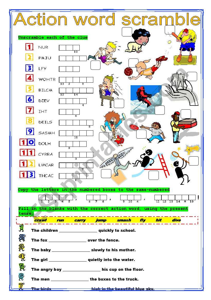 Students unscramble the words, then write the number next to each word in the boxes of the matching pictures. The last exercise is a fill-in-the-blanks. Answer KEY included.