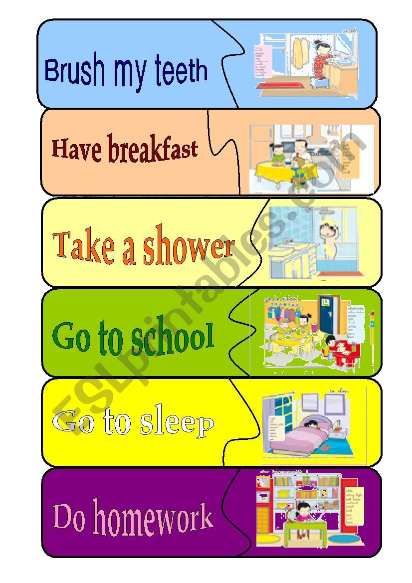 Matching game to learn daily routines. Students cut and match the pieces of paper. Enjoy!