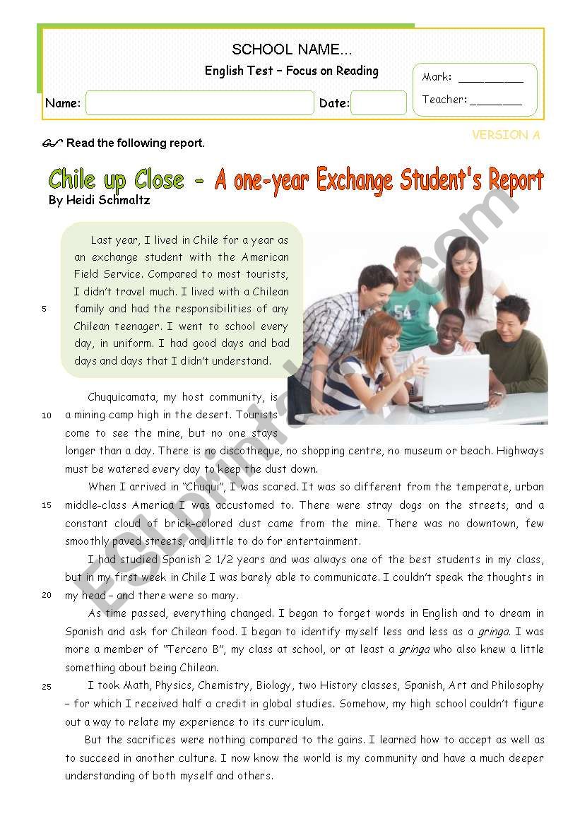 "Chile Up Close - A one-year exhange student´s report" - 2 Versions of the same Reading Test for mixed ability classes