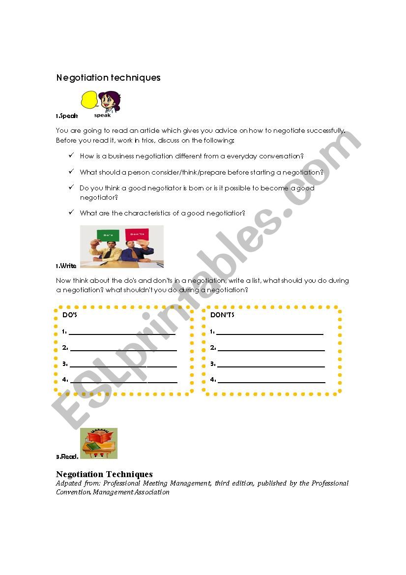 I prepared this worksheet for my adult students who work in the tourism industry, it consists on different exercises about negotiation and negotiation techniques, it has a couple of speaking activities, a reading and a written exercise.