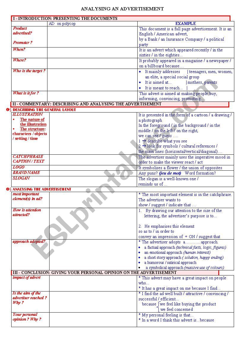 This document is meant to help my students understand an ad on television because while watching there are various aspects that need to be considered, such as the visual impact, the use of images, audience, linguistic features, purpose and message of the advert.Hope it will be usefull !