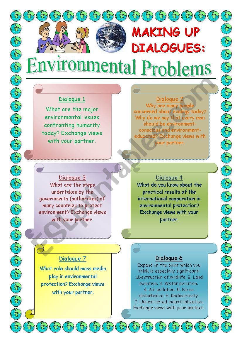 The ws contains 10 tasks for making up and acting out dialogues about environmental problems. Thank you very much for downloading! Have a nice day!