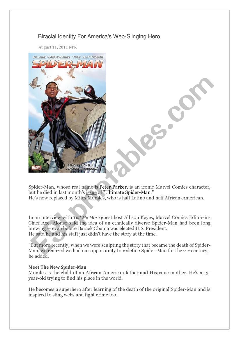Written comprehension activity on a new Marvel hero with a biracial identity.