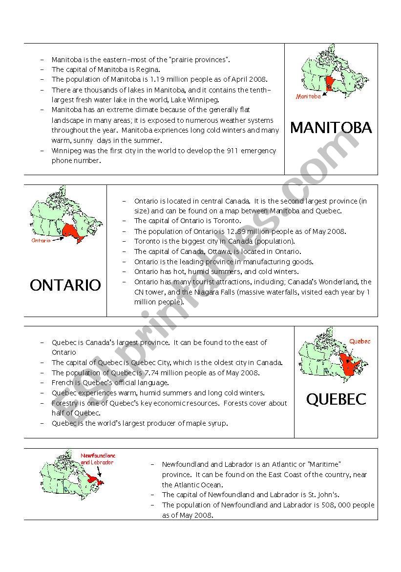 This is the second handout of three. This is a handout of Canada´s provinces and territories. It includes facts about geography and climate, population and interesting facts.