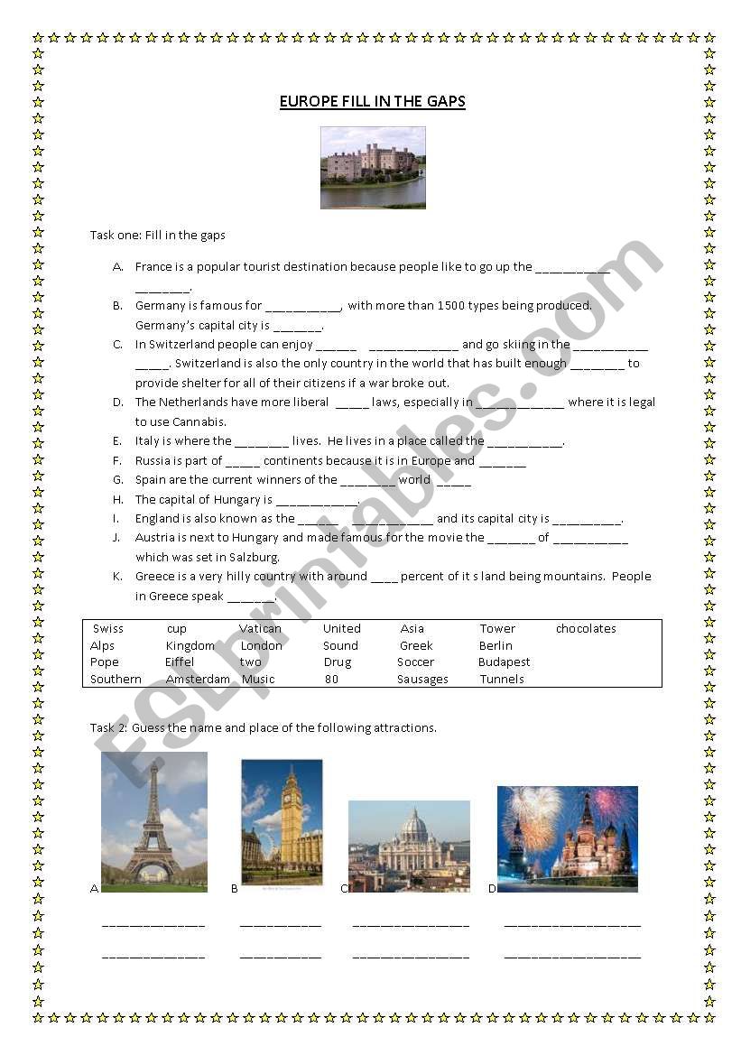 Fill in the gaps activity about different countries in Europe. Could be used as an introduction to Europe or to test basic knowledge of Europe. Answers are provided.