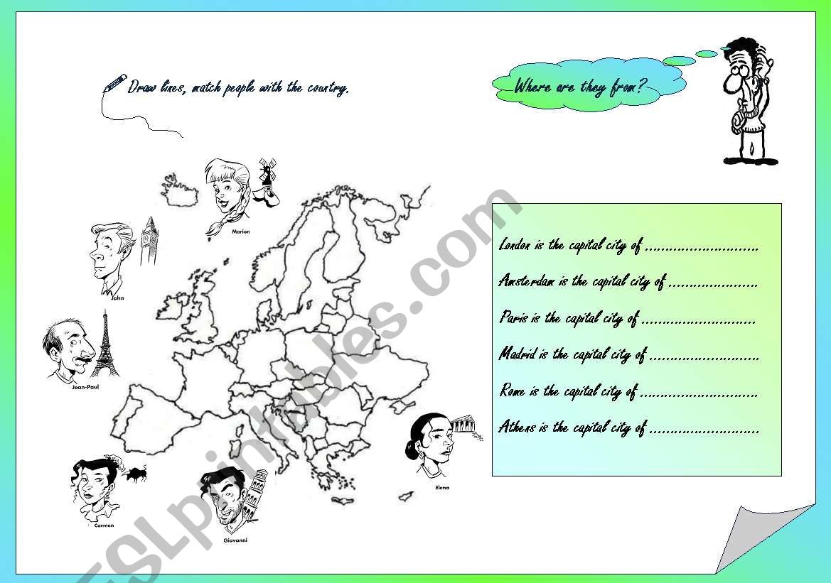 A map of Europe with people to match the country on the map. Excercise for the capital cities, countries and nationalities included. Key included. Fully editable.