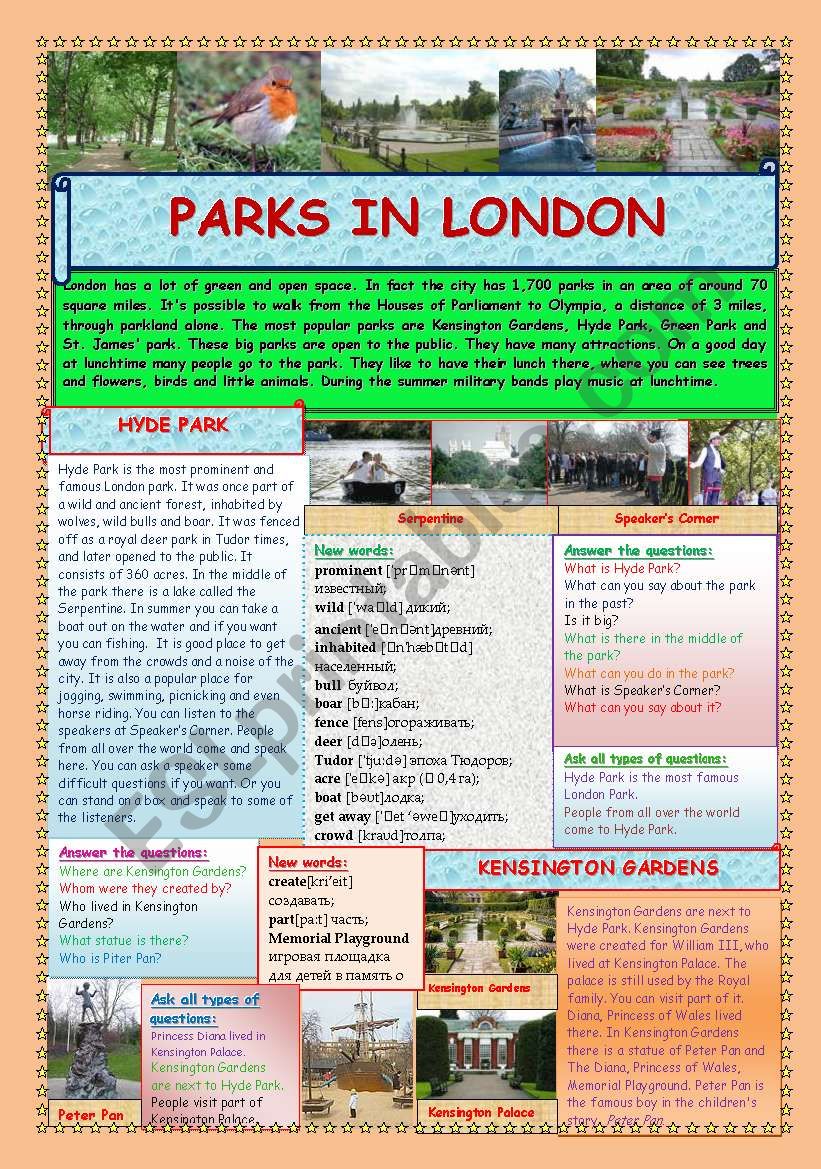 It is a worksheet about the most famous parks in London. You can find not only information about the parks but also some exersices (answer the questions, ask all types of questions). Have a good time. Your Angel..