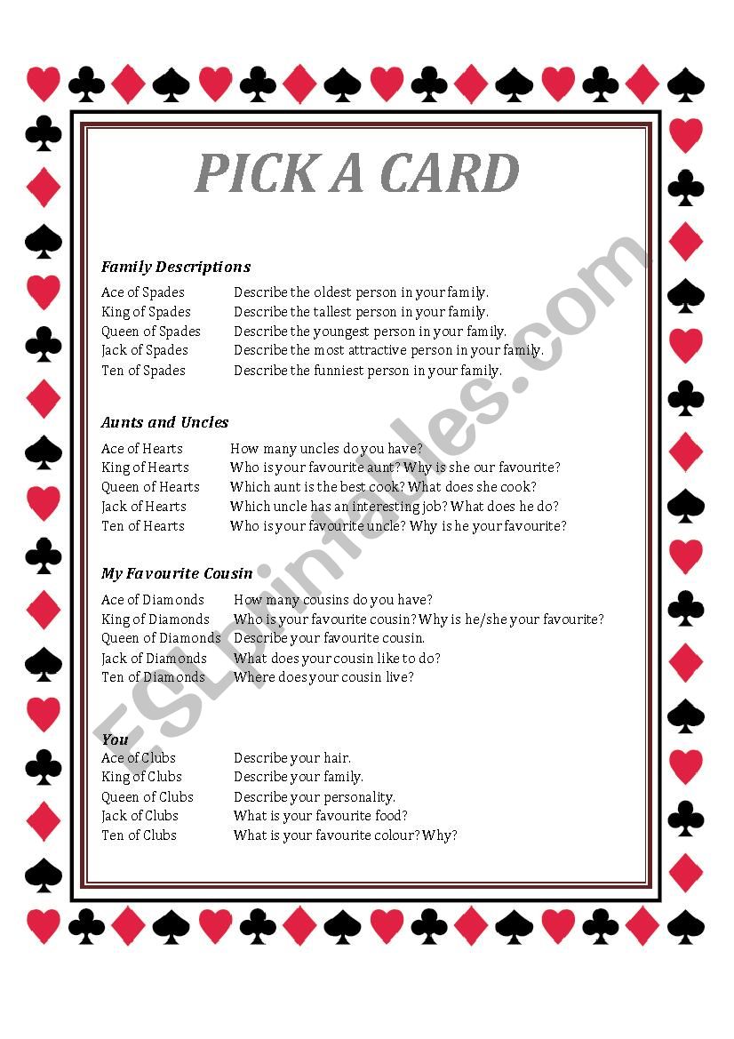 Great conversation activity. Perfect for practicing family vocabulary and physical descriptions. Students work in pairs or groups. As a follow up, have the students pick a card and write their answer in paragraph format.