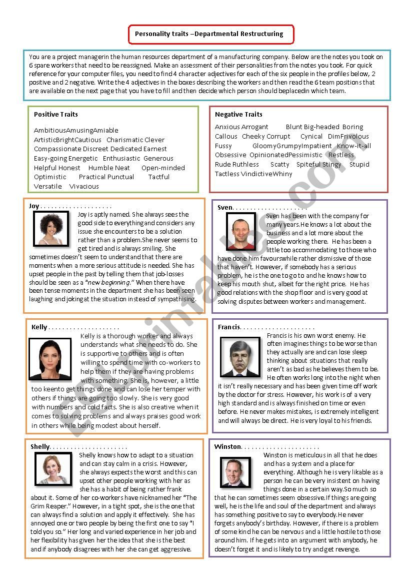 Similar to my other worksheets but with this one the objective is to put each person into a team that is best suited to their skills. You can get them to debate who goes where once they have done all the vocabulary and read the boxes out loud.