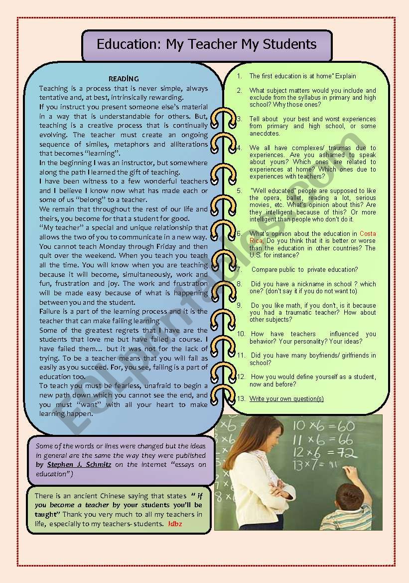 Education and the impact of teachers in our lives.An adaptation of an essay as a reading to start with the topic, then, asking and answering questions in small groups or pairs for speaking. Thank you TUGI for the template