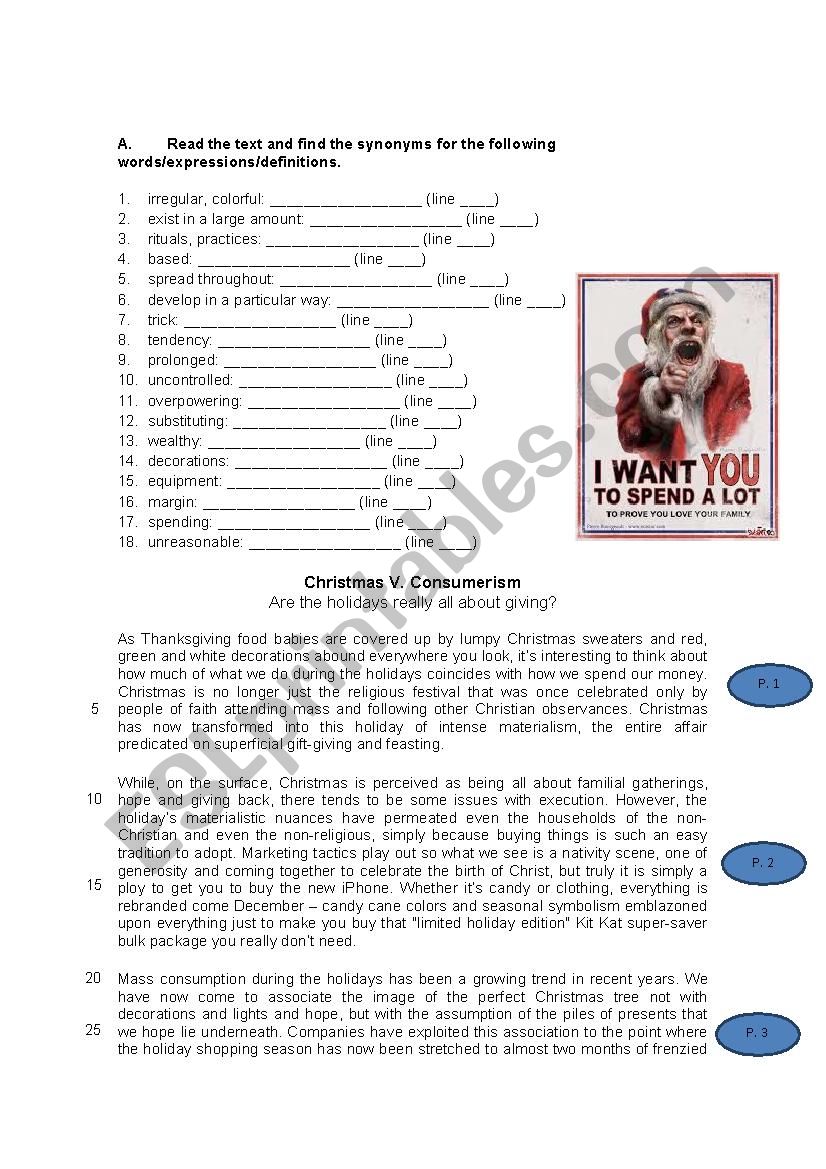Here´s a reading worksheet on overconsumption at Christmas. To warm-up for the text I will use some cartoons. Then, before I hand out the worksheet the students will be ordering the paragraphs of the text.