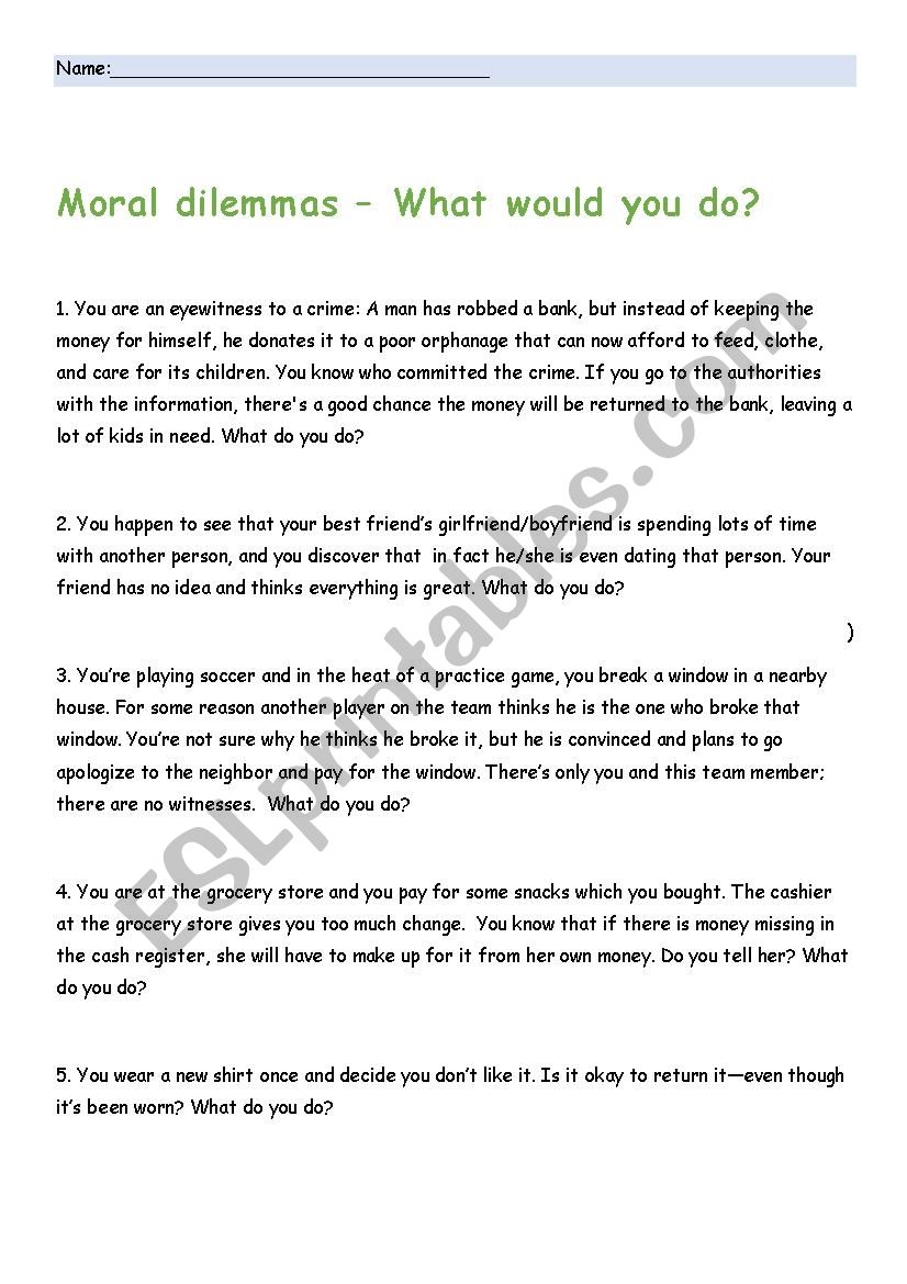 A series of moral dilemmas for discussion in class. A great activity for high school and for adult classes as well. Works well as individual work, pair work, or group work. There is a worksheet attached where the student needs to rank the easiest and hardest dilemmas to solve and explain why.