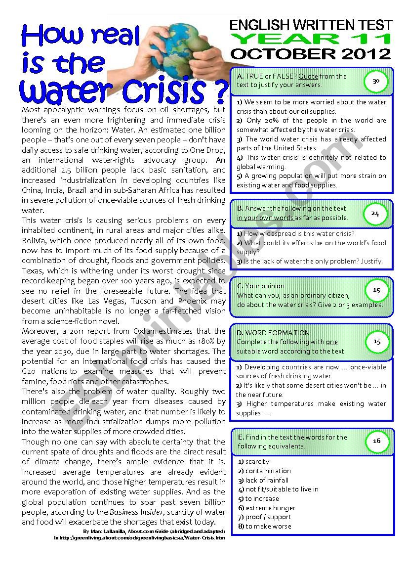 2page TEST (11 grade) WATER CRISIS (key included) worksheet