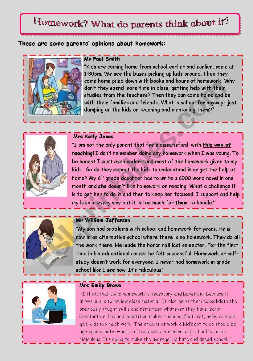 Short reading passages about homework in which parents give their opinions + comprehension questions. The writing exercise consists in giving pupils´ pointts of view on the same topic.