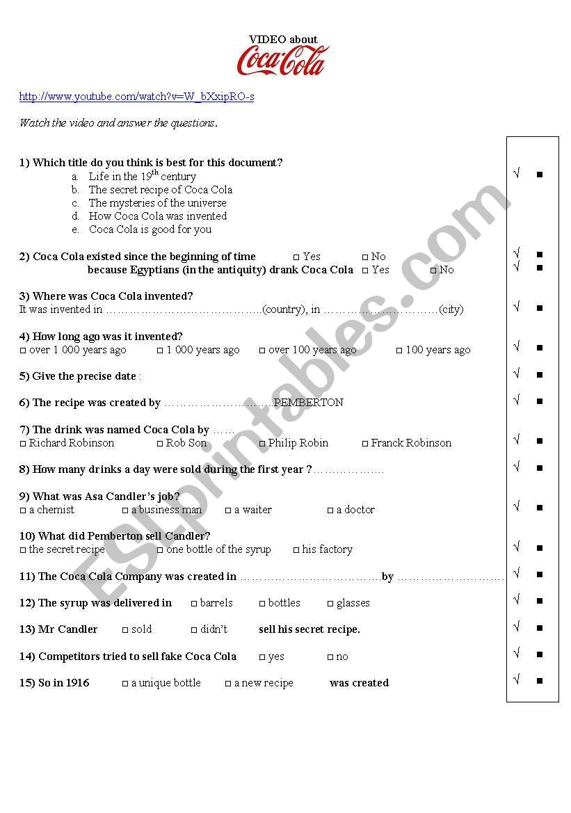 A useful video if you want to deal with the invention of Coca Cola. The video is quite long. I only use part of it. You can find the video on Youtube (the link is written on the worksheet).