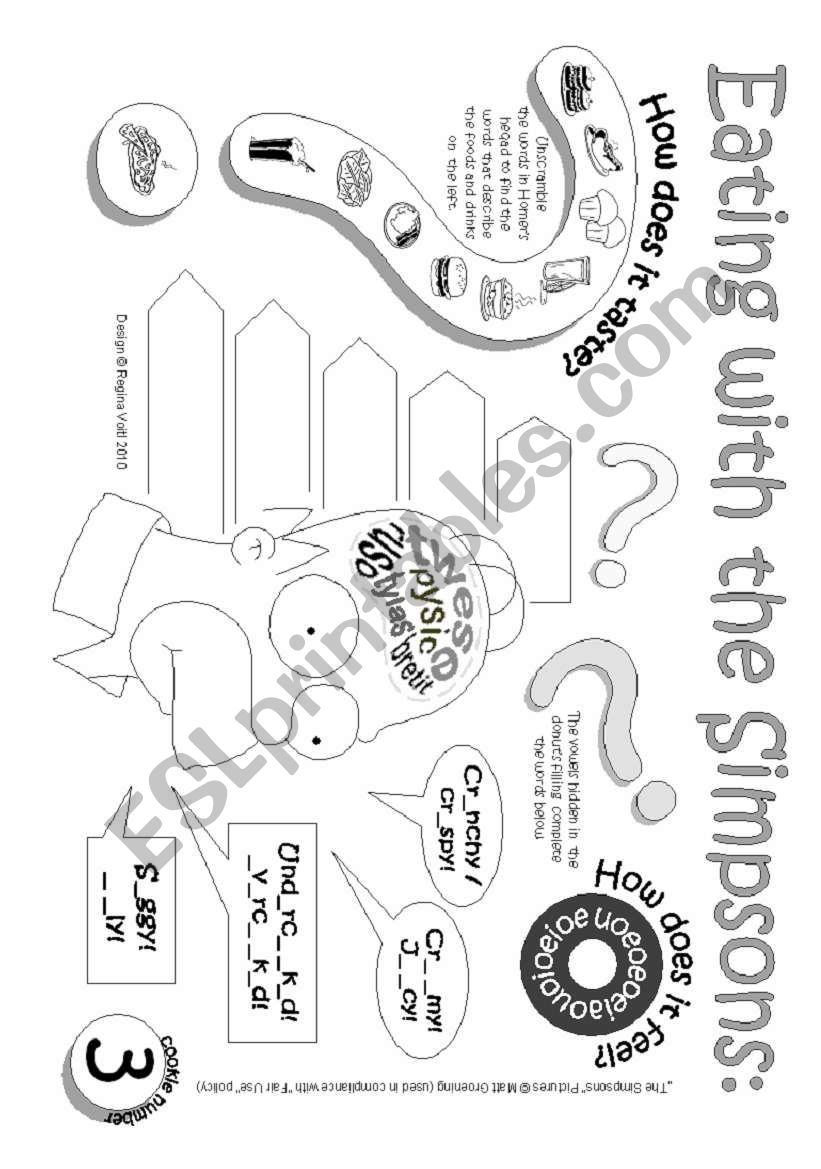 You can use this in combination with the food ws 1 and 2. I drew Homer myself. The words hidden are: sour, sweet, bitter, salty, spicy ;o) The textures / feels are: crunchy, crispy, creamy, juicy, undercooked, overcooked, soggy, oily. A follow-up resource is in the making. Please also check for updates, I sometimes tweek the design a bit..for the better ;o)