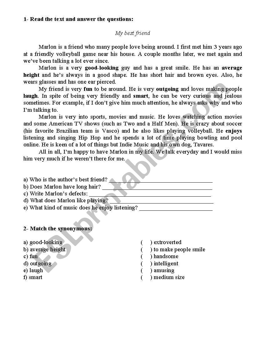 Vocabulary worksheets > Friendship > Reading - My best friend (adjectives)