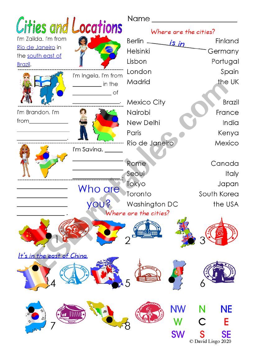 A 3 in 1 worksheet with introductions, capital and major cities, and countries, and general location of some cities within a country. Students can role play using the worksheet and city/country flashcards.