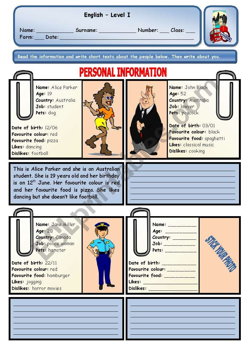 STUDENTS GET INFORMATION FROM THE CARDS AND WRITE SHORT TEXTS. (NAME, AGE, DATE OF BIRTH, JOB, COUNTRY, PETS, FAVOURITE COLOUR/FOOD, LIKES AND DISLIKES)