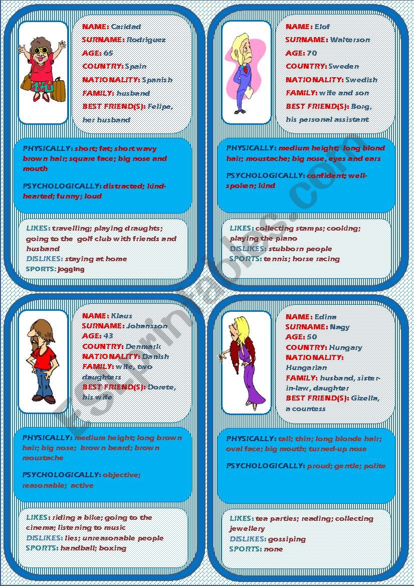 This is the third set of cards on personal identification. Each student is given a card and with the information given he/she has to do a speaking activity.