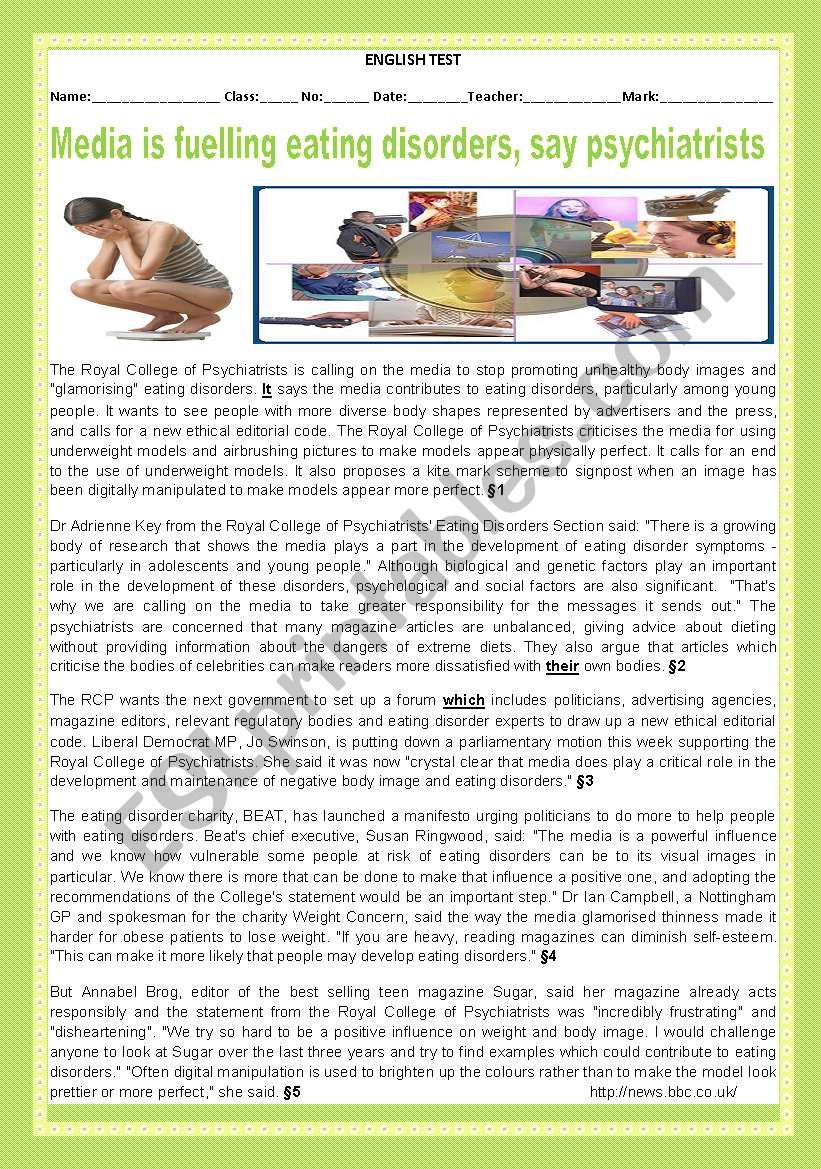 TEST:TEENS AND MASS MEDIA - MEDIA IS FUELLING EATING DISORDERS, say psychiatrists worksheet