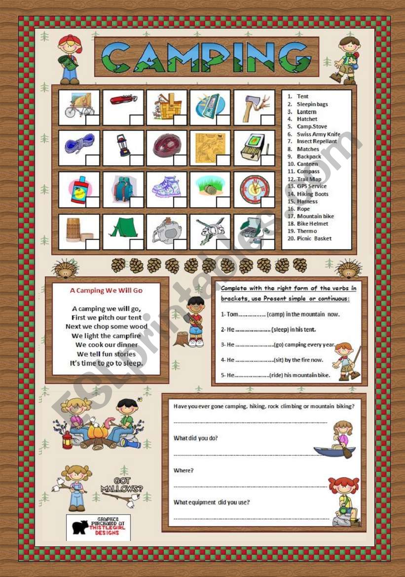Camping matching excercise, Camping Poem, complete with Present Simple or Present Continuous activity, and questions about the topic. :o)
