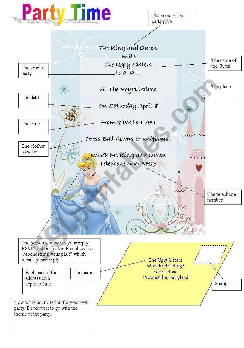 This worksheet can be used to teach how to write an inviation and also address an envelope. It gives an example then ask the student to create his or her own.