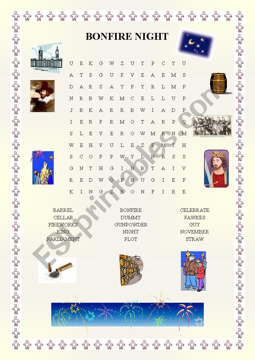 This worksheet contains a word search, a cloze test and some questions to answer about Bonfire Night. 2 pages + key.