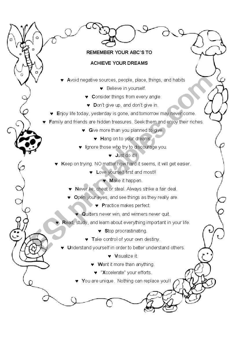 Vocabulary worksheets > likes and dislikes > Dreams > Abc to achieve your dreams