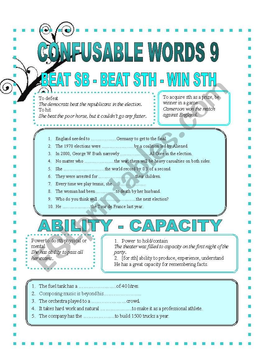CONFUSABLE WORDS 9-BEAT-WIN-ABILITY-CAPACITY-AVOID-PREET worksheet