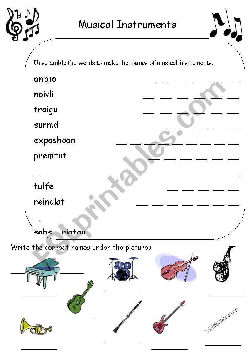 Musical instruments worksheets: