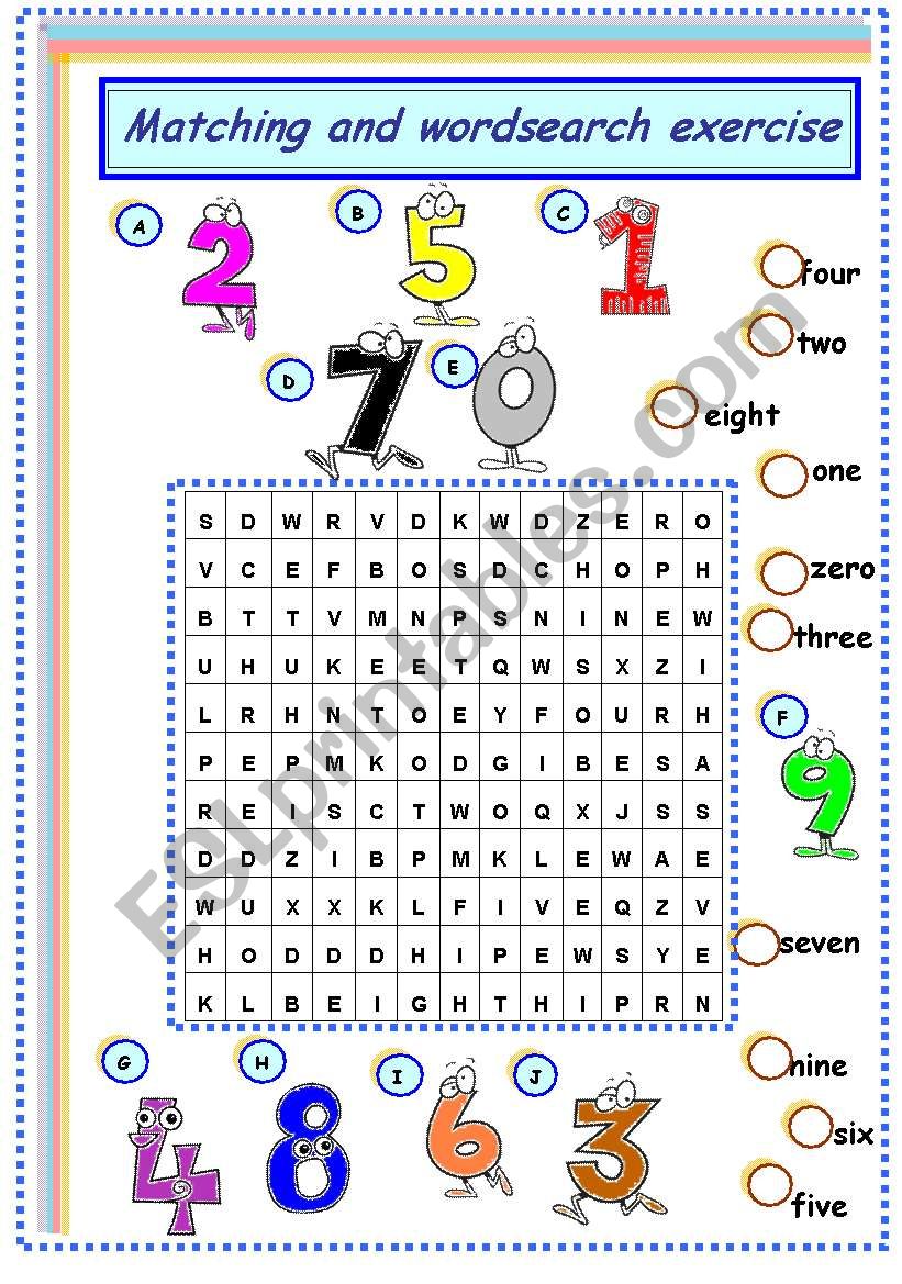 Ss have to match each number picture (0 to 9) to the right word by writing the correct letter and then find it in the wordsearch below. If you work with beginners useful to revise colours, numbers and their spelling. Nice day!!