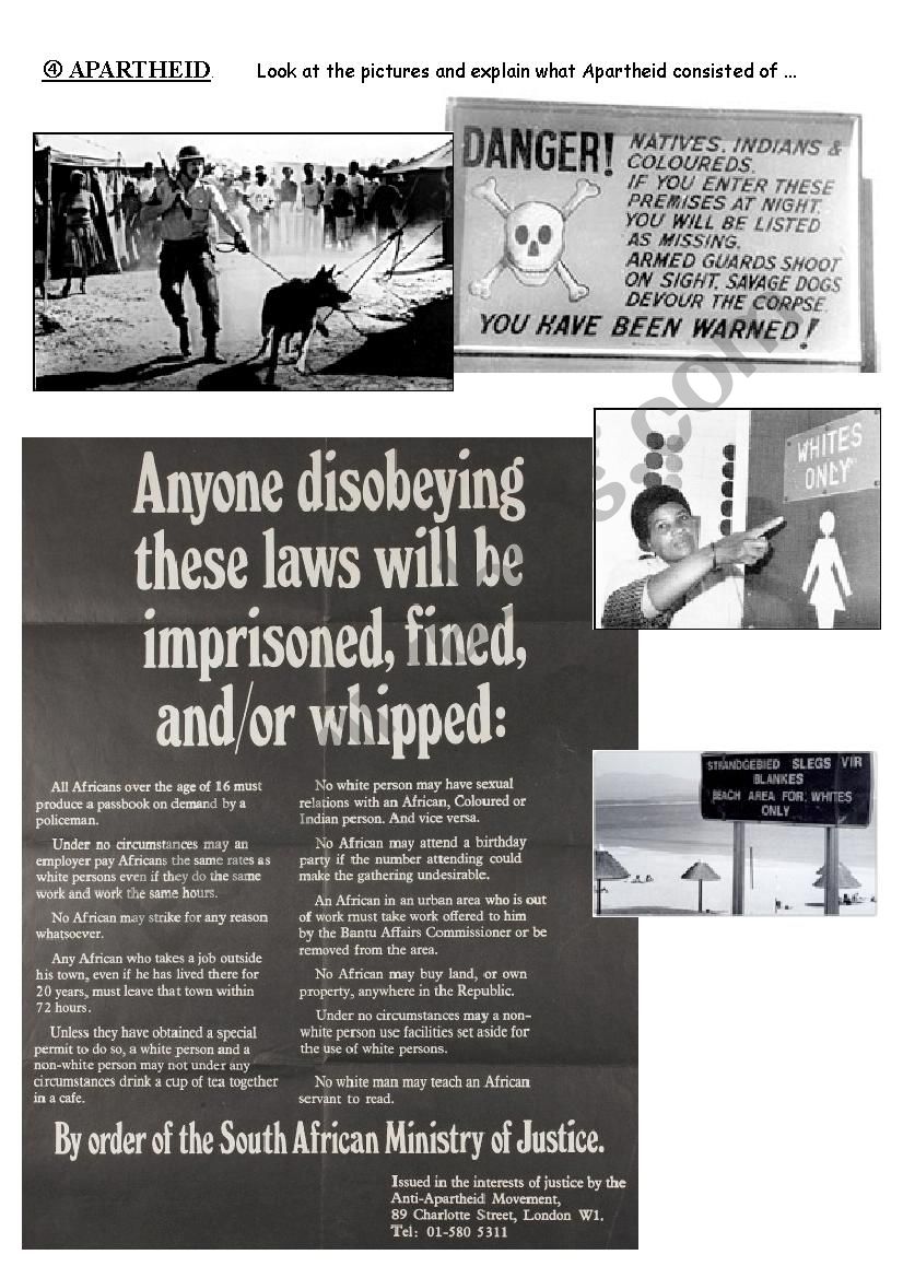 Here is a speaking / writing activity on Apartheid. Through the descriptions of different pictures, the students are going to discover this political system established in Africa from 1948 to 1990.