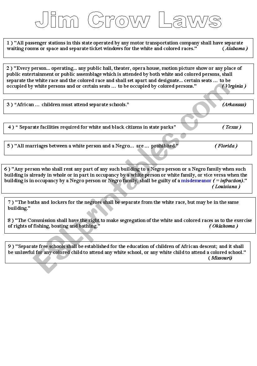 Vocabulary worksheets > Peace and solidarity > Civil rights > jim crow laws / civil rights